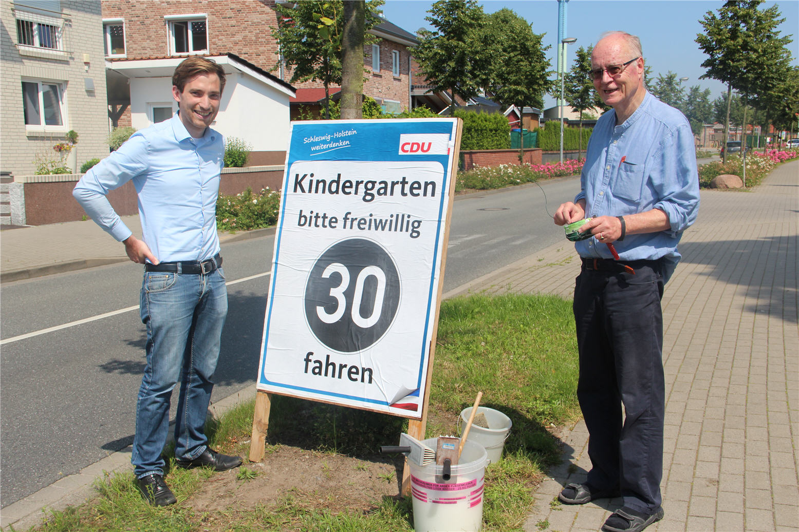 Lukas Kilian (links) und Dr. Rainer Neumann von der örtlichen CDU Glinde haben trotz  der sehr sommerlichen Temperaturen die Plakate ,,Tempo 30" geklebt und im Holstenkamp  und der Kaposvar Spang
