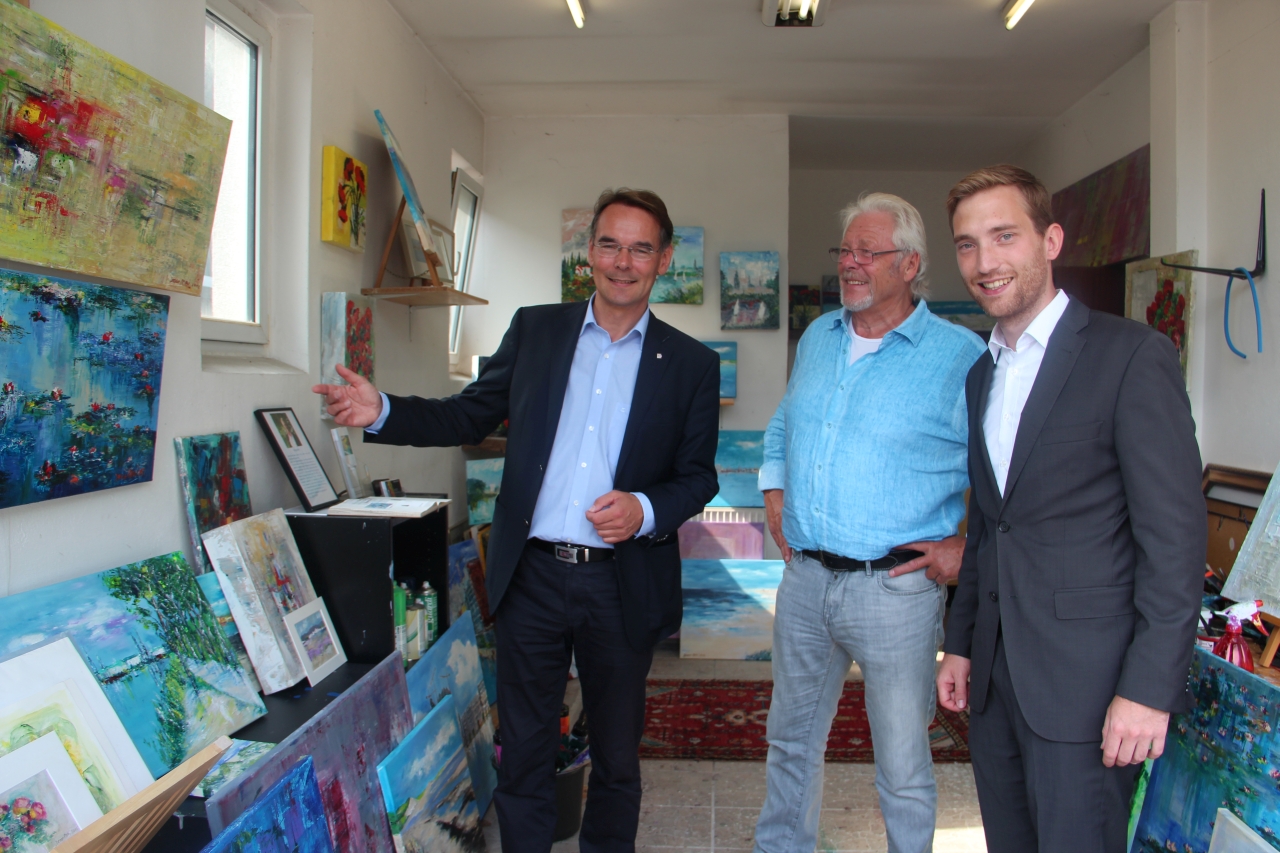 Auf seiner Tour durch Stormarns Süden machte Ingbert Liebing, CDU Spitzenkandidat für die Landtagswahl in Schleswig-Holstein im Mai 2017, Station beim bekannten Maler Detlef Norbert Maier, der im Rahmen des vom Kreis organisierten Tag der offenen Ateliers auch seine Tore für Interessierte geöffnet hatte. Auch Lukas Kilian hatte sich eingefunden, der für den Landtag 2017 kandidiert und dem einige Werke des Künstlers nicht unbekannt sind.