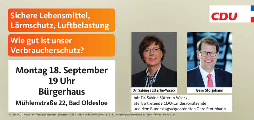 Mit Dr. Sabine Sütterlin-Waack und Gero Storjohann MdB Termin 18.09.2017 19:00 bis 21:00 Bürgerhaus Bad Oldesloe Mühlenstraße 22 23843 Bad Oldesloe zum iCalendar hinzufügen zum Google-Kalender hinzufügen Empfehlen Sie uns!Bei Facebook teilen Bei Twitter (X) teilen Bei Whatsapp teilen Diese Seite drucken Diese Seite einem Freund schicken